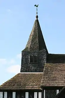 The timber frame features close studding with a middle rail.[1] It rests on a stone plinth, the infill is rendered brick and the roof is of slate. At the west end is a shingled square tower with a shingled broach spire ending in a weather cock. This is surrounded by lean-to roofed aisles on the north, west and south sides. The tower has a western arched door with a 20th-century door which incorporates 17th-century iron strap hinges.[1] The body of the church consists of a three-bay nave with north and south aisles, a two-bay chancel and north and south chapels at the ends of the aisles, and a south porch.[8] The former Principal Historic Buildings Officer for Cheshire County Council described the exterior as "disappointing" and considered that 19th-century alterations "have tended to detract from its external medieval appearance", but noted that "internally it has a great deal of character and interest."[9]