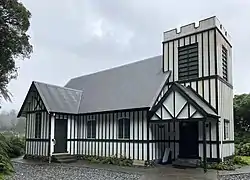 St James Church in Franz Josef on the West Coast of New Zealand's South Island is a small Anglican church in a garden setting. Built in 1931 in a Tudor style, it is notable for its use of clear glass windows and the view over Waiho Gorge from its altar. This view originally included Franz Josef Glacier, a famous scene recorded on a 1946 Peace Stamp, but the glacier has since receded.