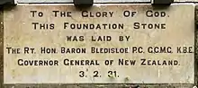 The site was cleared for building in March 1930, tenders were called in November of that year, and a contract for the construction was awarded to Bullock and Stewart in 1931.[4] The foundation stone for the church was laid by the Governor-General, Lord Bledisloe, in early February 1931.[1] The construction cost of the church was around £1000–1400.[2][1]