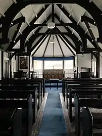 The church is described as of 'Selwynesque' or Tudor in style.[5] The walls are constructed of board-and-batten, with a corrugated iron roof. There is castellated bell tower. The church is decorated with a highly distinctive style, with dark brown paint used to highlight the exterior battens and roof trusses. Rather than the more usual stained glass windows, the building features three clear plate glass apsidal windows, overlooking the Waiho River. When the church was built it also had a view of the Franz Josef Glacier, but by 1953 this had retreated out of view.[2] From 1985 to 2006, the glacier generally advanced and thickened, and by 1997 it was once again visible through the altar window before retreating again.[6]
