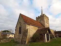 The church is constructed in flint, pebbles and clunch, with clunch and limestone dressings. Repairs have been carried out in brick. The flat roofs are covered in copper, the nave roof is tiled, and the spire is covered in lead. The plan consists of a nave with a north aisle, a central tower, and a chancel with a north chapel. Along the north aisle wall are buttresses and three three-light windows. The north chapel has a diagonal buttress to the east, two windows and gargoyles. In the middle stage of the tower are small round-headed windows, and the bell openings in the top stage have two lights. Its parapet is battlemented, and on top of the tower is a small lead-covered spirelet.[1] The spirelet is twisted; this was caused when a flagpole was tied to it in 1897 to celebrate Queen Victoria's Diamond Jubilee, and it was damaged in a gale.[2] The chancel east window has four lights. In the south wall of the chancel are a two-light window and a lancet window, and between them is a priest's door. The south wall of the tower is supported by two large buttresses, between which is a two-light window. The south wall of the nave contains a large three-light Perpendicular window. To the west of this is a timber-framed porch with a gable and plaster rendering including a small section of pargeting. This leads to the Norman doorway, which is decorated with chevrons, and its tympanum contains a rare stepped cross.[1]