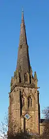 The church is constructed in sandstone ashlar with slate roofs. Its plan consists of a 5½-bay nave with a clerestory, north and south aisles, a three-bay chancel with a two-bay organ-house to the north, a three-bay chapel on the south with an attached vestry, and a west steeple with a north porch. Its architectural style is Decorated. The buttressed tower is tall and in three stages. On its west face is a small two-light window in the bottom stage, and a lancet window in the middle stage. On the north and south sides are diamond-shaped clock faces. In the top stage are two louvred bell openings on each side, each with a crocketed gablet. Above them is a cornice with gargoyles, and a parapet with corner pinnacles. The pinnacles are linked by flying buttresses to smaller pinnacles clasping the spire. The spire is tall and octagonal. At the base of the spire are two-light lucarnes with gablets, and above these are two tiers of small lucarnes. To the north of the tower is a two-storey gabled porch. In its lower storey is a doorway flanked by crocketed niches, and in the upper storey is a two-light window flanked by blind windows.