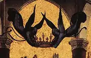 The central panel, called the Mystic Marriage of St Catherine, depicts Mary seated on a throne beneath a baldachin covered with sumptuous brocade.[8] Two seraphim hover directly beneath the canopy, holding her crown; they wear deep blue robes, and in the uncleaned version have blue faces and hands, a style evocative of earlier Netherlandish painters such as van der Weyden and Robert Campin.[26][27] The Christ child sits on his mother's lap, holding an apple in one hand and slipping the ring on St Catherine's finger to signify the mystic marriage with the other hand.[8]