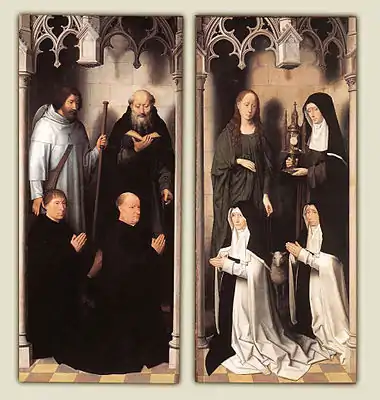 Unlike his predecessors Jan van Eyck and Rogier van der Weyden, who typical painted exterior wings in grisaille, Memling presents the saints in a realistic manner. Although the donors in van Eyck's Ghent Altarpiece and van der Weyden's Beaune Altarpiece are also painted realistically, they are placed within architectural niches separate from the adjacent statue-like grisaille saints. Memling breaks with that tradition in these exterior panels, but the subdued palette he uses retains some sense of grisaille.[14] The donors are dressed in their Augustinian habits; the two men in stark black and the two women in white on black. The saints are dressed in monochromatic clothing. St James wears a light blue cloak and St Anthony's is grey. St Agnes is dressed in drab green and St Clare is also in a dark habit.[13] Although the figures seem to be in two niches, they are enclosed in a single shallow space, with stone walls behind, trefoil arches above, and two columns adorning the outermost edges. Where the wings open is a single column which has the appearance of two separate columns.[13]