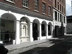 Along with the majority of 97 parish churches in the City of London, St John the Baptist upon Walbrook was destroyed by the Great Fire in September 1666.[4] In 1670 a Rebuilding Act was passed and a committee set up under Sir Christopher Wren to decide which would be rebuilt.[5] St John the Baptist was not one of the 51 chosen;[6] instead the parish was united to that of St Antholin, Budge Row,[7] and the site retained as a graveyard.[2]