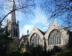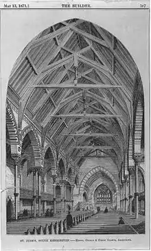 St Jude's Church, Courtfield Gardens, Kensington, London, was designed by architects George Godwin and Henry Godwin, and built between 1867–70; the tower and spire were constructed in 1879. It was built on the northern portion of Captain Robert Gunter's estate. The project was overseen by Reverend J. A. Aston, and financed by John Derby Allcroft, a wealthy glove manufacturer.[1] The construction, not including the tower, pulpit, font and organ cost £11,300, and was undertaken by Myers & Sons.[2]