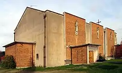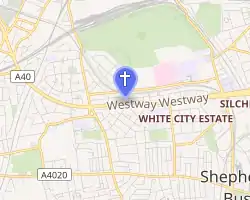 St Katherine Westway is a Church of England parish church in Hammersmith, west London.[1] Its original dedication was St Catherine Coleman, named after the church of St Katherine Coleman in the City of London, whose sale funded its construction in 1922, to a design by Robert Atkinson - it was assigned a parish in 1929.[2][3] Westway refers to Westway, the road beside which it stands. The original church was destroyed by bombing on 14 September 1940 and the foundation stone for the present one was laid on 25 October 1958.