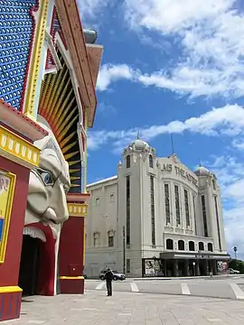 The area adjacent to the Palais Theatre known as the Triangle Site, including the Palace music venue, is the subject of a major re-development, first proposed in 2005. The proposals stipulated the restoration of the Palais Theatre, but controversially many advocated the demolition of the Palace, one of the area's main live music venues.[33] To save the Palace, a legal battle ensued. Ironically, the Palace burned down spectacularly during an arson attack,[34] and fears were held for the Palais. The winning development in 2007 plans a series of lanes, promenades and walkways rambling through eating and drinking spaces, art installations, entertainment venues, retail outlets and open grassy spaces. Further controversy over the new development was caused when the tenants who vacated the Palais illegally removed its 80-year-old chandeliers.[35]