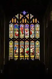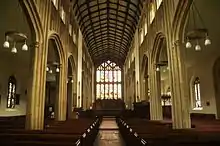 There is no chancel arch. Between the nave and the aisles are four-bay arcades, with Tudor-style arches carried on lozenge-shaped piers, and there is a three-bay arcade between the chancel and the chancel chapels. The stone reredos dates from 1838 and consists of canopies over inscriptions of the Creed, the Lord's Prayer and the Ten Commandments. There are carved screens between the chancel and the aisles dating from about 1900.[1] The Jacobean communion table was donated to the church in 1610.[3] The wooden pulpit is polygonal.[1] It dates from 1906, and contains carved figures of the Four Evangelists, Bishop Egwin, and Saint Lawrence.[3] The font is medieval and consists of an octagonal bowl on an octagonal stem. The south chapel has a stone fan vaulted rood and a floor of encaustic tiles. It contains a copy of the medieval font.[1] In the east window is stained glass of 1862 by Thomas Willement, which includes depictions of the Resurrection, the Last Supper, and coats of arms.[3] The windows in the north and south sanctuary walls are by Gibbs. The east window in the south aisle dated 1847 is by O'Connor, and the east window in the chapel is by Hardman & Co. In the north aisle are three windows from the early part of the 20th century by Geoffrey Webb, and there are other windows from later in the 20th century by Evans and Co. of Smethwick, Paul Woodroffe of Stroud, A. L. Wilkinson and Francis Skeat.[1] The two-manual organ was made by Nicholson of Worcester in 1867.[3][4]