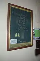 On the church walls is a fragment of an embroidered altar cloth bearing the initials GG George Green, of Western Corbett House and IR, and the date 1682.[1]