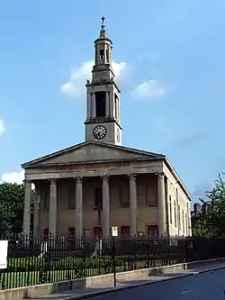 The builder was Mrs Elizabeth Broomfield of Walworth and the foundation stone was laid by the Archbishop of Canterbury on 14 April 1823. The church was consecrated by the Bishop of Winchester on 25 July 1825.[10] The main front, in a rather simplified version of the Corinthian order, has a stone portico with six fluted columns. A tower rises in three stages from the roof just behind the portico.[10] The church is very similar in appearance to St John's, Waterloo, and to two other churches by the same architect: St George, Wells Way, Camberwell, and Holy Trinity, Trinity Square, Southwark.[11]