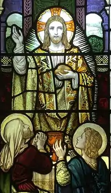 The window immediately on the east of the main door on the south wall is a two light window by James Powell and Sons. It portrays The Supper at Emmaus and Christ baptising.[27]