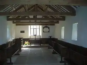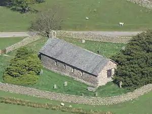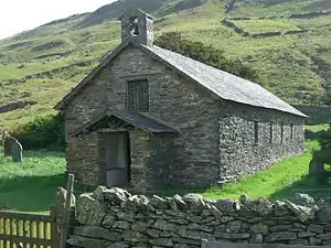 The present building was probably erected at the end of the 16th century, replacing the chapel, the last reference to which occurs in a document of 13 April 1541. In 1714 the church floor was flagged as the congregation were no longer prepared to endure the damp earth floor. In 1839, William Ford, in his book "Description of Scenery in the Lake District" described the building as "a chapel with low roof and simple bell-gable, and a picturesque yew-tree".[5] The church underwent a series of restorations, the last of which was in 1882 when the roof was replaced, the old box pews were removed and the same wood was used to construct the side benches.[1] The singers and musicians gallery was taken down and new window frames installed.[6][7]
