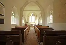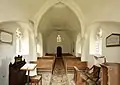 The interior is in white, including the boarded and plastered ceiling vault. Behind the latter, the roof timbers are scissor-trusses. The floor is in brick, laid in a herringbone pattern in 1789. The box pews are of the same date, but these were cut down in size in 1865. Older pews survive, dated 1637.
