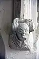 The priest’s doorway to the right is undecorated, in contrast to its exterior. Then comes a simple step sedilia inserted into the embrasure of the three-light Perpendicular window. Below the seat is a row of decorative four-petalled blossoms. In the east wall, to the right of the communion table, is a simple ambry (now doorless) where one would expect the piscina of the medieval altar. The latter is gone, and is replaced by an ornate wooden communion table dated 1633. Above, the east window’s embrasure continues down to a shelf which looks like the original altar’s gradine. On the wall flanking the window are two triangular pieces of wood each carved with an angel -the original purpose of these items is unknown.[14] The original ambry in the north wall is ornate, and has an ogee-topped frame with tracery and a crowning finial, also a pair of thin little pinnacles with crockets. Compare the exterior of the priest’s doorway. To the left is the vestry doorway, which has a moulded doorcase enclosed by a rectangular hood mould with carved leaves in the spandrels. The hood mould stops are portrait busts with ornate headdresses.