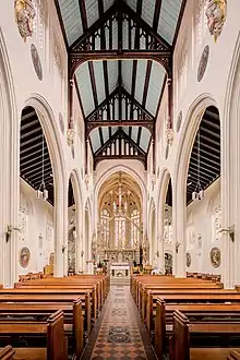 The church was designed by Augustus Pugin[2] in 1837 to replace a small Gothic building in nearby Chapel Street.[3] It was Pugin's first expression of his Gothic Revival style. He originally planned for the tower to have a 100 feet (30 m) spire, but budget restrictions prevented this from being implemented.[4] His final design was presented on 17 March 1838, and construction began that same year, with the foundation stone being laid in July 1838.[5] Building was completed by 9 October 1839, when the dedication service took place with Cardinal Nicholas Wiseman preaching.[5] The cost of construction had been £1,400. The wood sedilia in the sanctuary was donated to the church by Pugin.[5]
