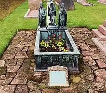 Along the south side of the remaining wall of Porden's old church are the graves of the Dukes of Westminster, other members of the Grosvenor family and their relatives. A square enclosure in the northeast part of the Old Churchyard, now covered with gravel and surrounded by a low wall with crosses in the corners, marks the spot where the Grosvenor family vault was located within Porden's church. The names of those ancestors of the Dukes of Westminster who are interred here are recorded on a brass plaque inside the present church building. The grave of Edward George Hugh, Earl Grosvenor (1904–1909), by Detmar Blow and Fernand Billerey, sculpted by Emile Madeline, is a Grade II listed building.[12]