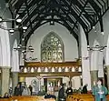 The west wall, showing the balcony and the Stations of the Cross and Resurrection by parishioner Iain McKillop