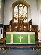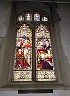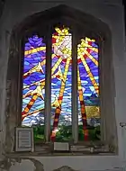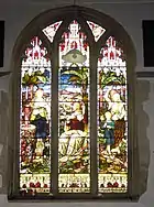 The glass in the church is mainly Victorian in date and of little artistic merit. The East window consists of three lights containing glass depicting the Last Supper installed in 1888 in memory of James Wagstaff. The pair of windows in the West are 15th-century with a tall two light window and a single lancet-shaped window lower down. The larger of the windows was installed in 1865 in memory of the Rev George Bidwell and portrays the Nativity, Crucifixion and Resurrection of Christ with the figures of Christ and Mary Magdalene depicted in the Garden of Gethsemane.[3]