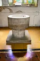 The West tower is 15th-century with a semi-circular stair turret projecting from the North East angle.[3] The West elevation has a 19th-century pointed-arched doorway to the ground stage and a three-light four-centred arched window to the second stage. On the tower's North side the remains of a stone lamp holder are still visible about 12 feet up.[3] The belfry level has pointed-arched two-light windows to all sides. All the roofs were repaired in the 19th-century but retain much of the original moulded timbering with that to the South aisle being 14th-century, with those elsewhere being 15th and 16th-century. The pews are 19th-century while the circular baptismal font is of uncertain date. The East wall of the porch retains the indents of a memorial brass to a priest, with the central indent in the shape of a chalice.[1][2]