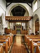 The South chapel dates to the 16th-century and has two windows in the South and one East window, all of three-lights. Originally there was a vestry to the north side of the chancel dating to the 15th-century but this was demolished in the 16th-century.[3] The four-centred South doorway is 19th-century. The nave has elements dating to the 13th-century but is mainly 14th-century in date and has five-bay 14th-century arcades to both sides; the South one is earlier in date with compound piers while the North arcade has octagonal columns. The clerestory has five 15th-century square-headed windows to each side, all of two lights except for the South East one which has three lights.[3]