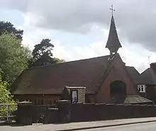 Handcross is a linear village of mostly Victorian buildings on the old London–Brighton road.[4][28] All Saints Church, at 51.0525°N 0.2023°W on the road to Horsham, is a small structure of red brick with a large, distinctive bell-turret at its west end.[29] When the A23 London–Brighton road was diverted in the late 1950s to run past the village and widened at the same time, the church had to give up some of its land. The tiny building now sits next to an overbridge and overhangs the bypass.[29][30]