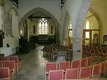 The east window of the chancel is an early-14th-century lancet with three trefoils. The exterior is hood-moulded. The north wall of the chancel also has a lancet window: this has quatrefoils and ogee headings.[4] The Covert Chapel has three windows, all with pointed-arched heads: that in the east wall has three cinquefoils (five-lobed lights), while the two in the south wall are simpler two-light windows.[4] The nave's north wall has one 19th-century window flanked by two dating from the 16th century and the blocked Norman doorway. All three are simple two-light windows with straight heads. Two windows in the south aisle also date from the Victorian restoration, as does the single window in the west wall.[4] Charles Eamer Kempe designed several stained glass windows for the church in the 1890s.[7]