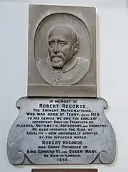 There is also a wall tablet in memory of Robert Recorde, an Elizabethan scholar, who introduced the equals sign ( = ) to mathematical calculation.