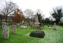 The lychgate constructed in 1875 is listed separately as a Grade II listed structure.[3] The churchyard contains a large number of Grade II listed monuments and headstones.[4]