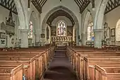 The north and south sides of the nave are divided from the aisles on each side with early 13th-century arcades of three bays on short circular piers. The chancel arch is early perpendicular. The roofs of the nave is early 15th-century with moulded crown post trusses. The scissor braced roofs to the aisles are 13th-century. The chancel roof is thought to be 19th-century. The east ends of each aisle contain a piscina. The font is 19th-century on an early 15th-century base.[1]
