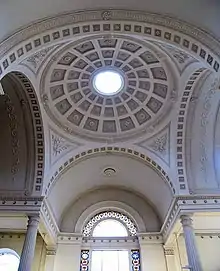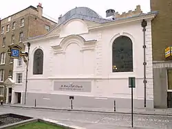There have been considerable further alterations since the 17th century. In 1787–88, George Gwilt rebuilt the west wall and replaced the tower in brick and in 1826–27 James Savage installed round-headed iron-framed windows in the north wall and replaced the vaults, ceilings and plasterwork.[7] In 1848–49 he added a cupola to the dome and cut windows through the chancel vault. In 1849, the 17th century woodwork was sympathetically augmented and adapted by W. Gibbs Rogers. In 1904 the church's parish was united with that of St George Botolph Lane, and St Mary-at-Hill received the sword rests, plate, royal arms, ironwork, organ and organ case from St George.[8] In 1939, the writer Dornford Yates used the church as a setting for some of the action in his thriller Gale Warning, calling it “St. Ives”. Use is made of the open-work screens on the roof.
