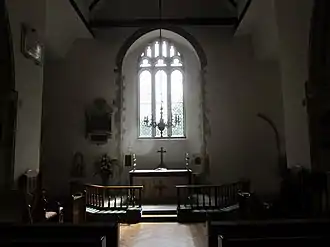 The style of the building is early English.[7] As built, the church was cruciform, with a chancel tower, transepts and aisles.[8] It is built of stone rubble with ashlar dressings, the porch is of brick and the roofs are tiled.[5] Originally the Chancel extended beyond the bounds of the existing east wall.[5] There were two Chantry chapels and, possibly, two aisles built in the 14th century.[5] There was also a vestry to the north of the Chapel area.[5] The north chapel and part of the Chancel were allowed to fall into ruin, probably in the early 16th century, but were rebuilt, using much of the original materials, shortly after 1660. During this rebuilding, the east window was moved to the current position, giving the church the unusual T-shape it has now.[6]