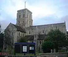 William the Conqueror had granted the Rape of Bramber, one of the six Rapes (subdivisions) of Sussex, to the de Braose family in the 11th century. Shortly afterwards, they founded a new church to serve the new settlement.[2] William de Braose died no later than 1096, which has been suggested as the date of founding,[4] but the first documentary evidence was a deed dated 1103, referring to Philip de Braose's return from the First Crusade.[5] At this time, he granted the advowson of the church to an abbey in the French town of Saumur, which held it until about 1250.[4][5] This abbey had an associated priory at Sele (present-day Upper Beeding), further up the river Adur, which became the church's patron in 1250. The patronage later transferred to Magdalen College, Oxford, and in 1948 to the Bishop of Chichester.[4] Locally, the church had originally been administered from St Nicolas' Church in Old Shoreham, but it was given its own parish in the late 12th century. The two churches have been part of a united benefice, served by the same vicar, since 1897, however.[4]