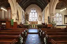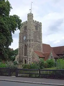 The church was rebuilt in its present form in 1494 (the date being carved in stone over the west door) possibly after incurring damage during the battle of Barnet in 1471. A church is believed to have stood on the site for over 800 years. The present building is in the Perpendicular style, and included two side chapels (in transepts) dedicated to St Anne and St Catherine.[1] The building was heavily renovated by the architect G. E. Street in Victorian times, and contains large quantities of Victorian woodwork furniture. The parish and church were heavily influenced by tractarianism and the Oxford Movement, and it remains a focus of eucharistic worship within the surrounding district. The church maintains a strong choral tradition.