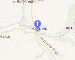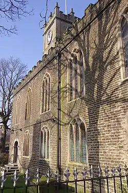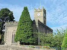 St Matthew's Church, Hayfield, is the parish church of Hayfield, Derbyshire, England. The church, parts of which date from the 14th century, is a Grade II listed building[2] and adjacent to the River Sett. Its five-stage clock tower is the main landmark for the village. The church is built in local gritstone ashlar in an Early English Gothic style and is surrounded by a small graveyard. It is also adjoined by a small church hall dating from 1977, erected over part of the graveyard, with a newly landscaped community garden on the north side of the building.