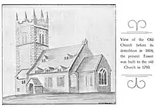 In the year 1793, the tower was rebuilt to its current form, including six bells (a seventh was added in 1909 and an eighth in 1947).[1] The rest of the church was rebuilt in 1818, at a cost of £2458, unassisted by any public grant. The builders were Bradbury and Rangeley.[2] The tower was raised in 1894; to place a new clock with four dials, and to chime the hour and quarter. It was funded entirely by members of the Slack and Bennett families, costing nothing to the church.[3]: 7
