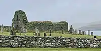 The ruins of St Olaf's church are located 0.5 km (0.31 mi) northwest of the hamlet of Lund, on the island of Unst in the Shetland Islands, UK.[1] The roofless building is a single-chamber rectangular structure, measuring 14.5 m (48 ft) by 6.76 m (22.2 ft). The thickness of the walls range from 1.1 m (3 ft 7 in) to 1.37 m (4 ft 6 in). Approximately 5.19 m (17.0 ft) of the eastern section of the building has been rebuilt. The fabric of the building is made of local rubble in lime mortar, and is in poor condition. It has been determined that church was built in the twelfth century and was in use until 1785.[1][2]
