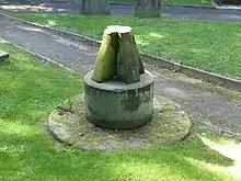 In the churchyard is a stone sundial of unusual design dating probably from the 18th century. It consists of a circular plinth on a circular stone step which carries a battered cruciform stem with an octagonal cap. The dial and gnomon are copper. It is listed Grade II.[8] At the churchyard gate is an 18th-century mounting block.[5] Also in the churchyard is the war grave of a First World War Canadian soldier.[9]