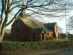 The church is constructed of red brick with sandstone dressings; the roofs are slate.[5] The church plan consists of a nave and chancel, with a south aisle, transepts and bell turret (covered in shingles and with a short spire) towards the west end.[8] There is a porch to the south. The windows are two-light, pointed headed, with quatrefoils. There is a three-light west window and a four-light east window with cusped ogees.[5]