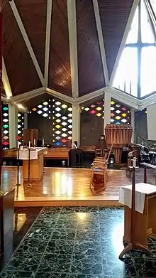 The interior includes artworks by Freda Skinner and Gerald Holtom.[6]
