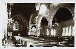 The interior is noted for its arcades of polished Aberdeen granite and Irish marble columns with carved capitals, encaustic tiled floors, a painted panelled barrel roof, richly carved stonework which features fruit and foliage inhabited with animals and birds, a stone pulpit resting on granite shafts, a baptismal font of Caen stone and a marble reredos. The interior walls are of Hollington stone. The church also includes several wall monuments to "tutors of this college".[3][5][6]