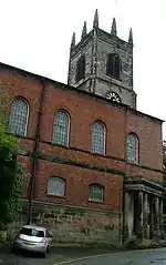 The church is built in red brick with stone dressings, the roof is of stone slate and the west tower is of stone.[1] Its plan consists of a five-bay nave continuous with a single-bay chancel, and north and south aisles. The tower is at the west end.[6] The tower has a clock and on its summit is a parapet and pinnacles. Two coats of arms are carved on the western wall.[5] The door is at the west end and is surrounded by a porch with Doric columns.[1]