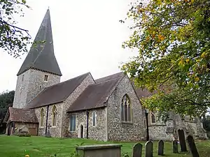 The "very good" south door with its "very delicate" carving attributed to stonemasons associated with Chertsey Abbey[6] and its adjacent walls are c1170 with some 13th-century remains in the chancel. The 15th-century broach spire-topped tower is built of ironstone[7] with a peal of six bells - five dating from 1798[4] and the sixth, the Peace Bell - added in 1919. This treble bell was added at the same time that the cracked tenor bell was recast.[8] Situated on the church's south-west corner, the tower is short and square with small louvred openings at the top of each wall with irregular openings placed elsewhere. The south porch is of the 16th-century. By the 19th-century the Norman church was becoming too small for the growing congregation[4] and it was restored and extended in about 1865 at which time the north aisle and north chancel chapel were constructed. The nave is built of roughly coursed flint and sandstone rubble. The large window in the east end is 19th-century of three lights in the late 13th-century style, but a single 13th-century lancet window is still to be found in the south chancel wall. In the Victorian north wall of the nave is reset a small 12th-century round-headed light, much repaired, while the three windows in the south wall date to the Victorian rebuilding.[1][7][9]