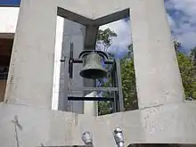 At the southern end of the front a tall bell tower made of three concrete fins squats over a small round drum of the meditation chapel, attached to the building by a slender covered corridor. The bell is mounted at the base of the tower and has raised letters, "ST. PETERS 1967".[1]
