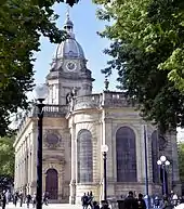 St Philip's Church was planned when the nearby medieval church of St Martin in the Bull Ring became insufficient to house its congregation because of the growing population of Birmingham. The land, previously named the Barley Close, was donated by Robert Philips in 1710. It is one of the highest points in the district and is said to be at the same level as the cross on St Paul's Cathedral in London.[1] Following an Act of Parliament, construction commenced in 1711, to the design of Thomas Archer,[2] and was ready for consecration in 1715, when it was dedicated to the Apostle Philip as a tribute to the benefactor Robert Philips. It appears to have been Archer's first church, apart from a rebuilt chancel at Chicheley attributed to him. Construction was estimated to cost £20,000, but the final figure was only £5,012.[2] (equivalent to £800,000 in 2020).[3] This was because many of the materials were donated and transported to the site at no cost. St Philip's served as a Parish church from 1715 to 1905.