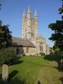 The tower was begun in the early 16th century and completed in the 1550s at the expense of the Duke of Northumberland and the Hungerford family. Nikolaus Pevsner wrote: "The distinguishing feature of the church is its proud and self-certain, somewhat heavy and certainly not elegant, crossing tower",[5] while Simon Jenkins describes it in England's Thousand Best Churches as "massive rather than graceful".[6]