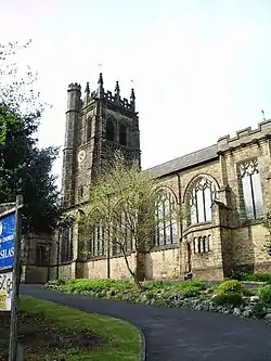 The church is constructed in sandstone with freestone dressings. The external walls are in yellow sandstone; the internal walls in red sandstone. The roofs are slated. Its plan consists of a nave with north and south aisles, a southwest porch, a north transept containing the organ chamber, a south transept comprising a chapel, a chancel with a north vestry, another vestry in the angle between the south transept and aisle, and a west tower.[2] The architectural style is Gothic Revival, described in the National Heritage List as Perpendicular,[2] and by the authors of the Buildings of England series as Decorated.[3] The tower is in three stages, with angle buttresses, and a polygonal stair turret at the southwest corner that rises to a level higher than the tower.[2][3] On the summit of the tower are pierced embattled parapets and pinnacles. The tower has a west doorway, above which is a five-light window. In its middle stage are pairs of ogee-headed windows, clock faces, and a frieze of shields. The top stage contains louvred bell openings, one on the south side, and two in pairs on each of the other sides. Along the walls of the aisles are large four-light windows. The porch is tall with an embattled parapet, canted angles, and angle buttresses. Above its moulded entrance arch is a statue of Saint Silas in a niche surmounted by a pinnacle. The transepts contain pairs of square-headed two-light windows, and have embattled parapets. The chancel has a south square-headed two-light window, a seven-light east window, a parapet of blind quatrefoils, and a southeast turret with a spirelet.[2]