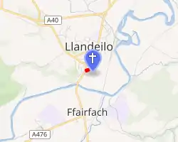 This large church is located in Church Street where it is conspicuous, with a very large churchyard. As a Christian centre, Llandeilo dates back to the sixth century. Very little is known about Saint Teilo, to whom the church is dedicated, but he seems to have travelled around Wales because there are several other churches dedicated to him in other places. He is believed to have made Llandeilo his main base and be buried there, although Llandaff Cathedral has disputed this. There is a legend that after his death, his body was placed in Llandeilo church and three clergy from different churches prayed that he could be buried in their churches (Llandeilo, Llandaff and his birthplace Penally). In the morning, three bodies were miraculously found, so that an authentic body could be buried at each church.[1]