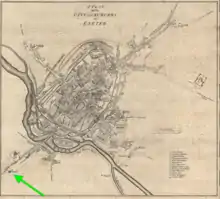 The parish church of St Thomas[2] stands outside the city walls of Exeter, immediately to the south-west of the city and separated from it by the River Exe. It is larger than any of the parish churches formerly encompassed by the city walls, thus within the city of Exeter proper. The mediaeval church burned down in 1645 during the Civil War, and was rebuilt before 1657.[3] An arcade survives from the earlier church of 1412, but the present exterior is Gothic of 1646 with a north aisle of circa 1810 and a chancel of 1829. There are three varieties of Gothic style here, 17th century, Decorated (ca. 1810), and Perpendicular (Victorian).[4] John Betjeman said little about it in his Collins Pocket Guide to English Parish Churches: the South (1968): only "fittings".