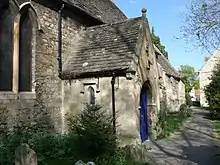 The church has a nave with a north aisle and vestry, a Perpendicular Gothic west tower, a chancel and a south porch.[4] The nave was rebuilt in the late 15th or early 16th century to meet a tower of approximately the same age; it is often dated to 1521, but appears to be built on older foundations.[1] The southern side of the nave contains what are probably thirteenth-century buttresses and a pair of Perpendicular Gothic windows.[5] The north aisle was originally built in the 13th century,[1] and rebuilt by H.J. Underwood in 1890; the vestry was built in the 17th century and rebuilt in 1846 to designs by Chamberlain, through the generosity of the curate, Alexander Penrose Forbes.[1] The church has been reroofed at least twice, in 1825 and 1897.[1]